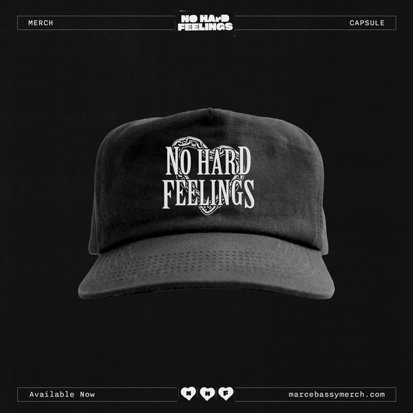 "No Hard Feelings" with barbed wire heart on a high-quality black hat